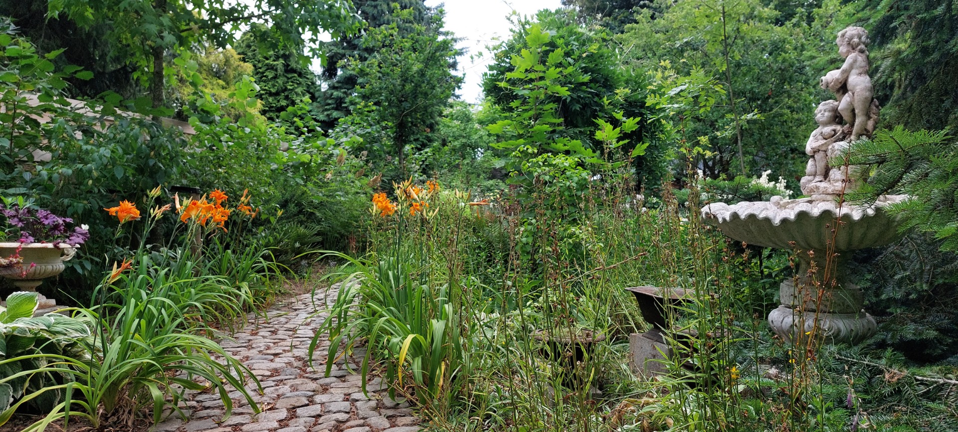 De tuin van Villa Rhaïce was oorspronkelijk een echte 'boerentuin' waar groenten werden gekweekt en dieren vrij rondliepen. De moestuin met prei en snijbonen, de vervallen serreconstructies, de dorre coniferen en de ren voor kippen, eenden en ganzen maakten in 2020 echter plaats voor een romantische belevingstuin, waar beelden en historische objecten het contrast met het weelderige groen opzoeken. De structuur van de tuin en de originele kasseipaden werden behouden, maar diverse zones kregen een meer wereldse bestemming, namelijk die van wandeling, verpozing en ontmoeting. Geïnspireerd door Versailles en Villandry, werd een tuin van vormen gecreëerd met gietijzeren tuinvazen en antieke ornamenten, sokkels en balusters, gloriettes en prielen, maar ook beelden en mystieke figuren.