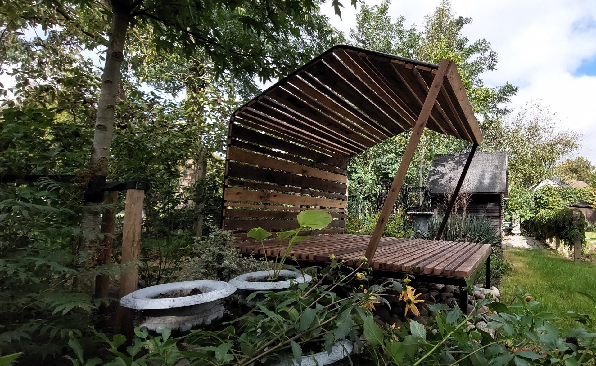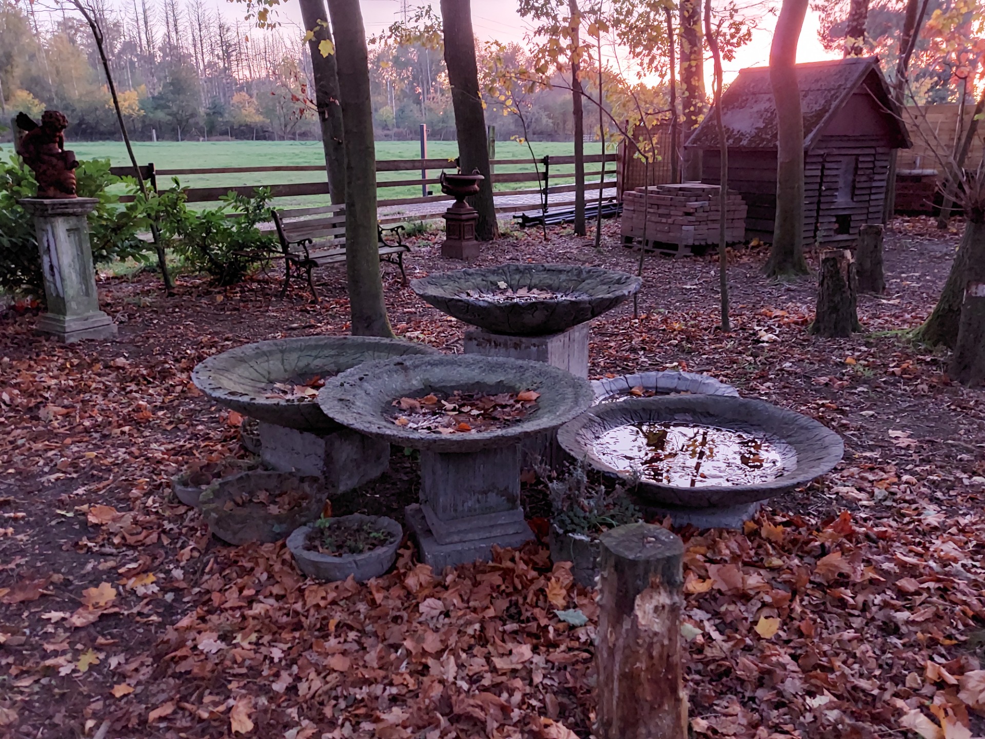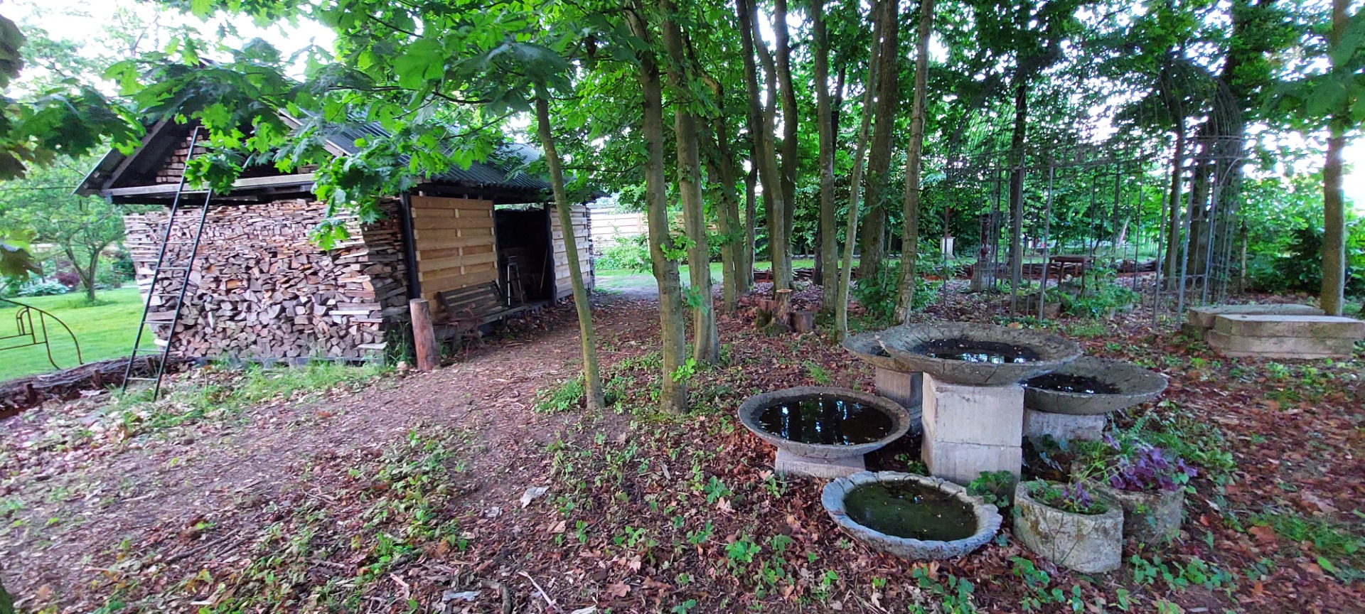 of aan betonnen waterschalen (Sculptured by Nature / Etienne Vanden Abeele). Zonnebaden kan in de geborgenheid van de boomgaard