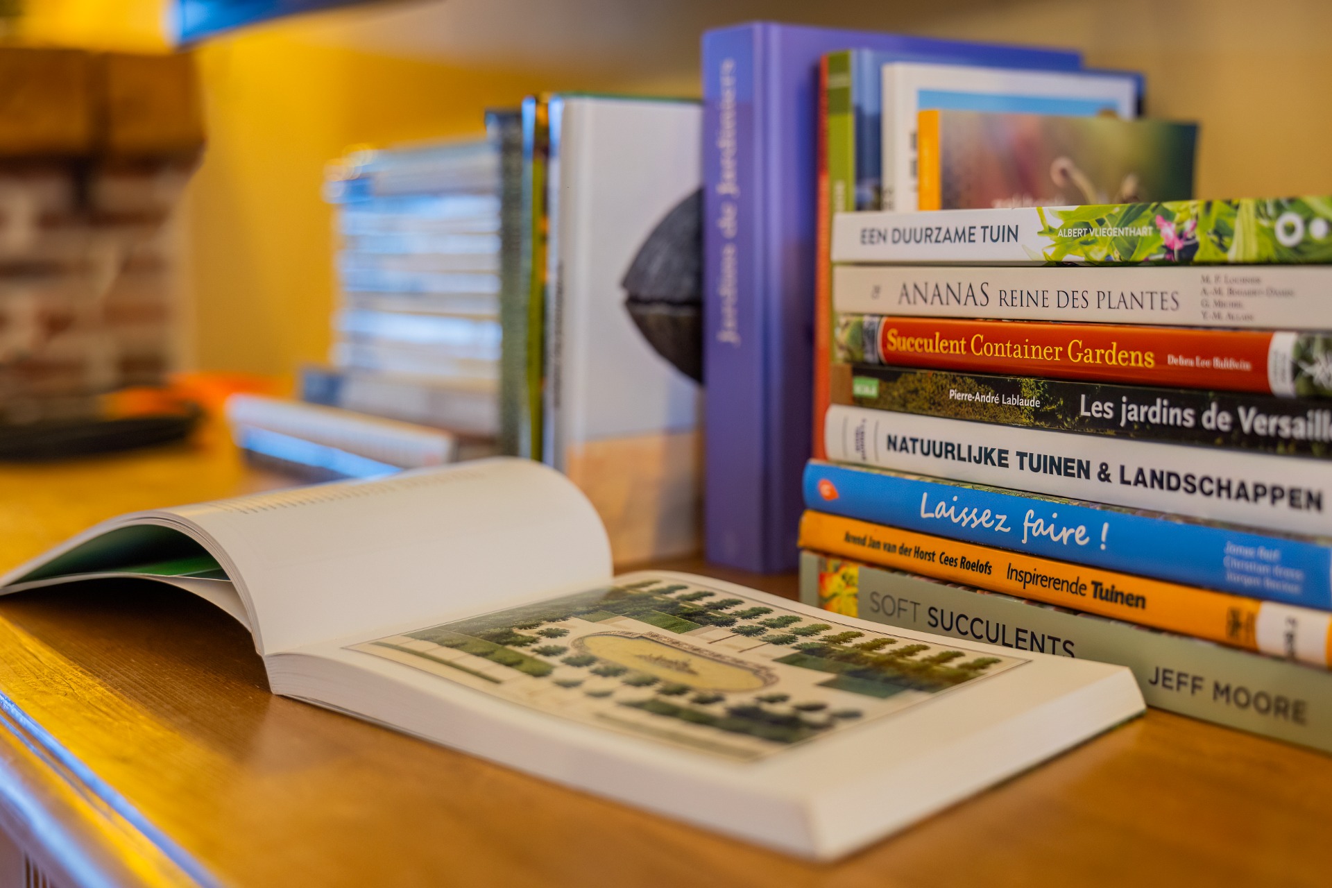 een inspirerende bibliotheek met boeken over tuinarchitectuur en plantkunde, maar